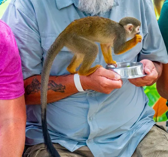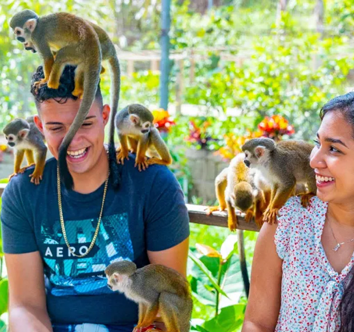 Next, visit Monkey Land, located in the tropical jungle. Listen to the sounds of nature while keeping an eye out for the playful squirrel monkeys that inhabit this lush environment. Trained staff will provide you with a plate of fruit to offer the monkeys. These curious and friendly creatures love shiny objects — so hold on to your belongings, or they might borrow them for playtime! This is an unforgettable opportunity to get up close with these adorable and entertaining little monkeys.