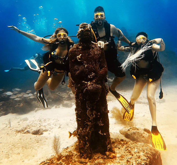 At 12:00 PM you are on the boat, leaving first to Underwater Museum for your first dive. From there it’s then only a 5 -10 minute boat ride to the second dive site, a local Isla Mujeres Reef.